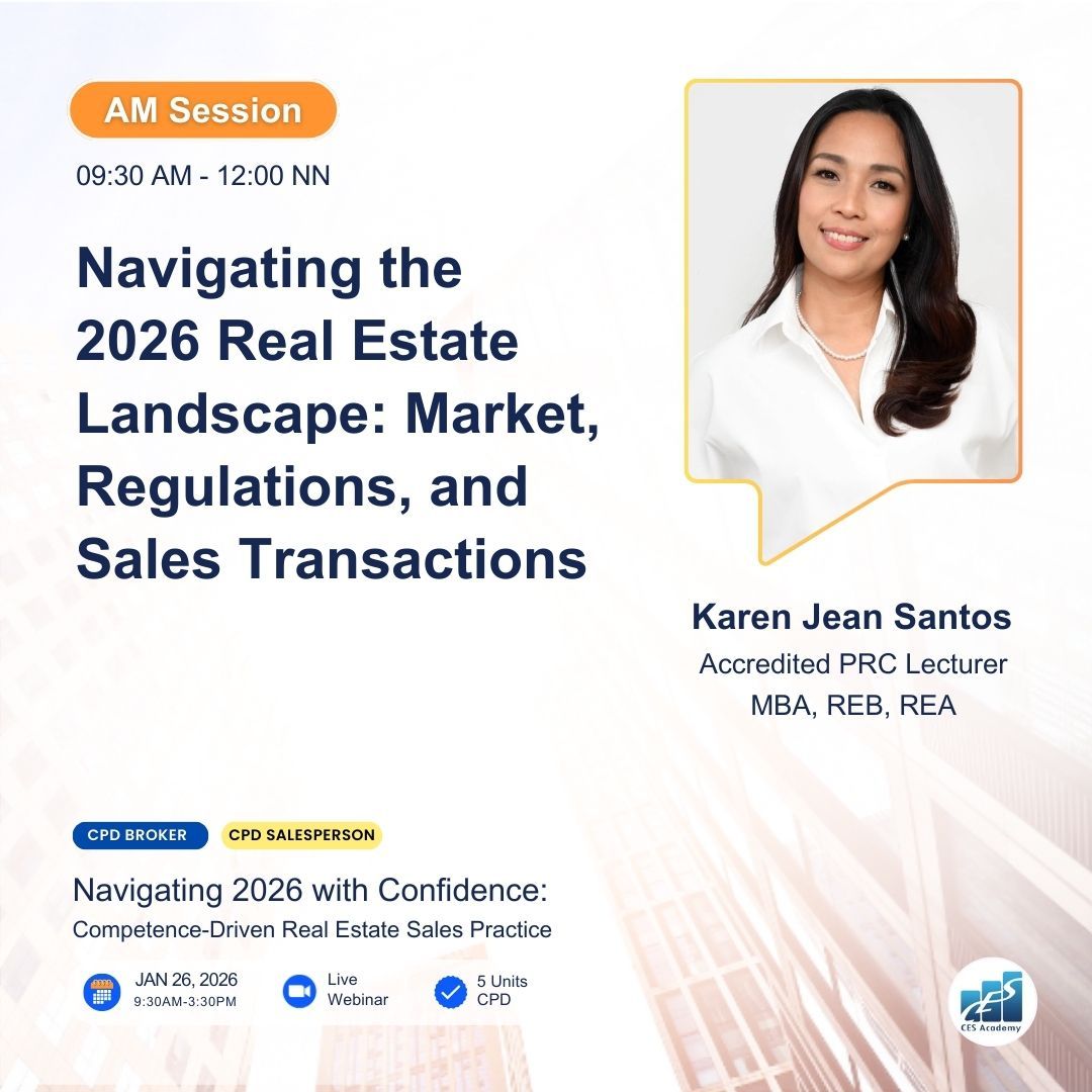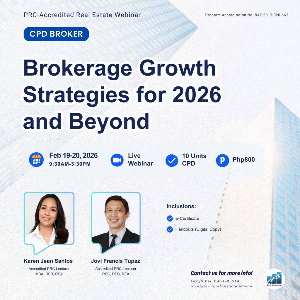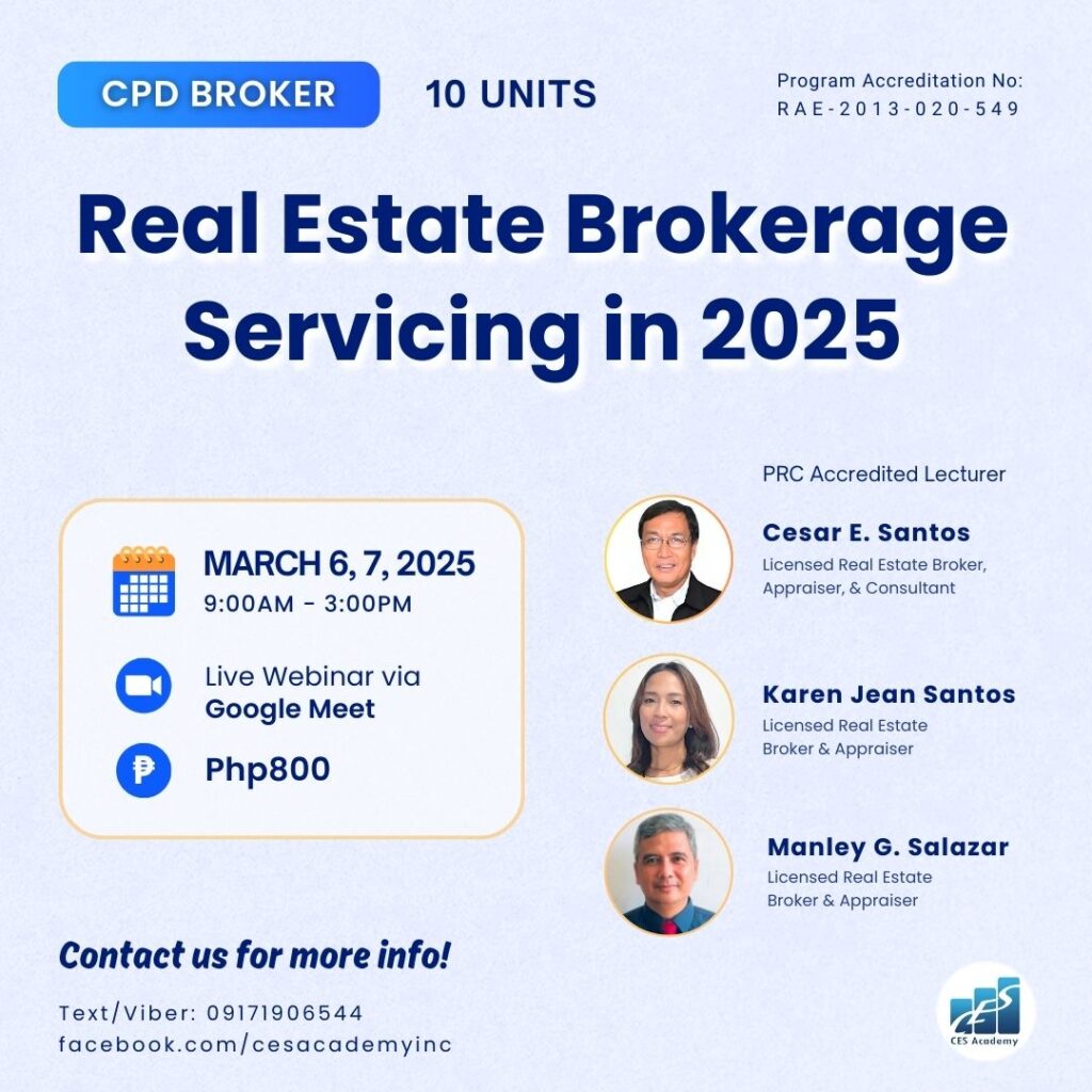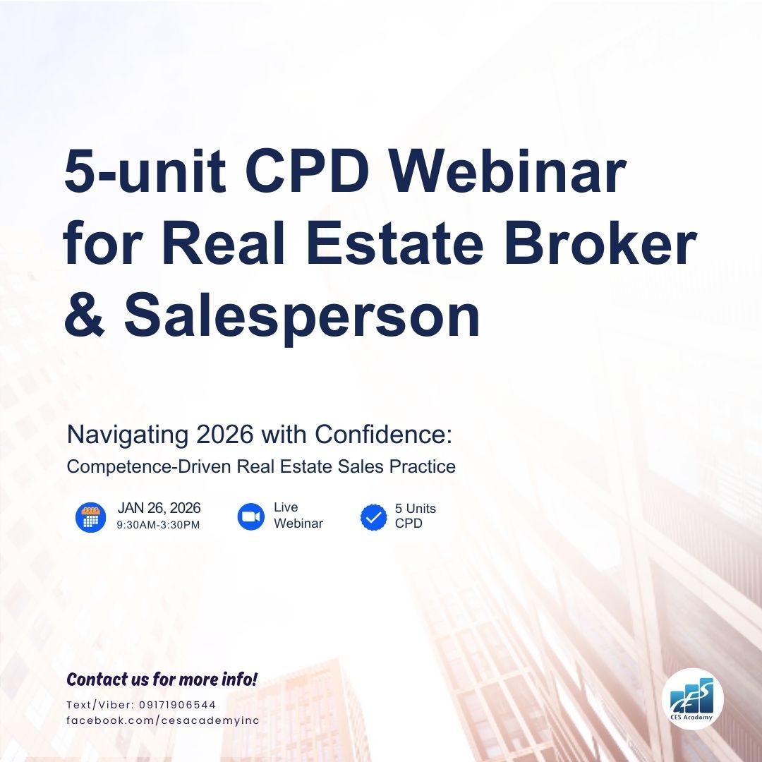CES Academy is a SEC-registered and PRC-accredited provider of real estate education and training in the Philippines. It is the best choice of review center when opting to take the PRC Broker’s and Appraiser’s Licensure Examinations. Likewise, it offers seminars and workshops on special areas like Documentation and Registration, Due Diligence, Real Estate Marketing, Property Management, Basic Appraisal, and Estate Planning, to name a few.