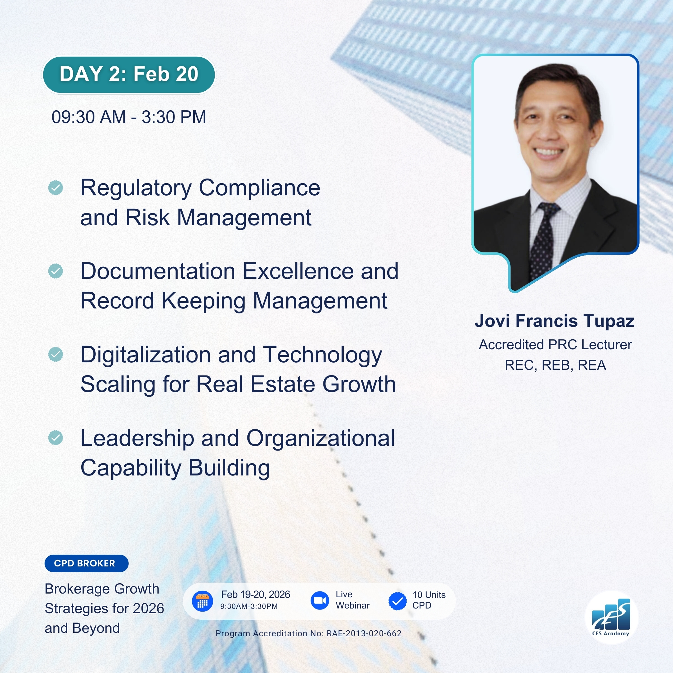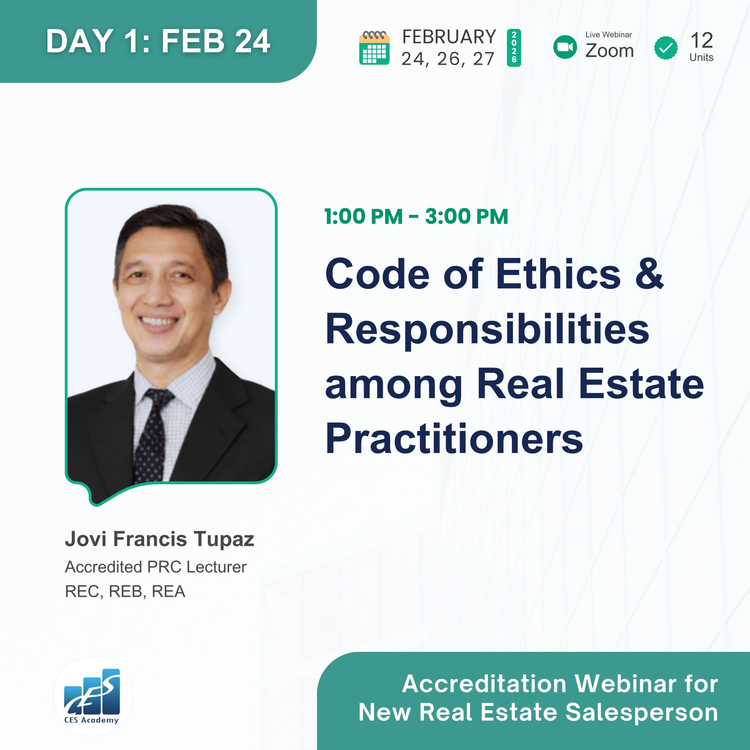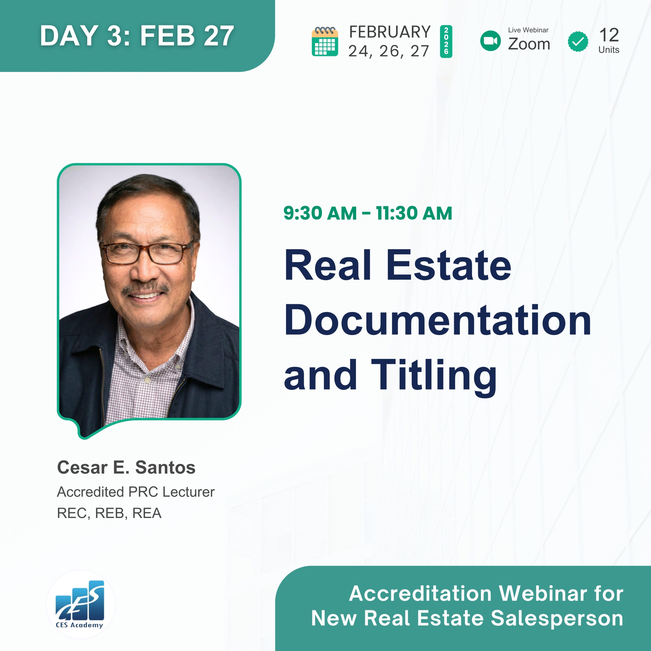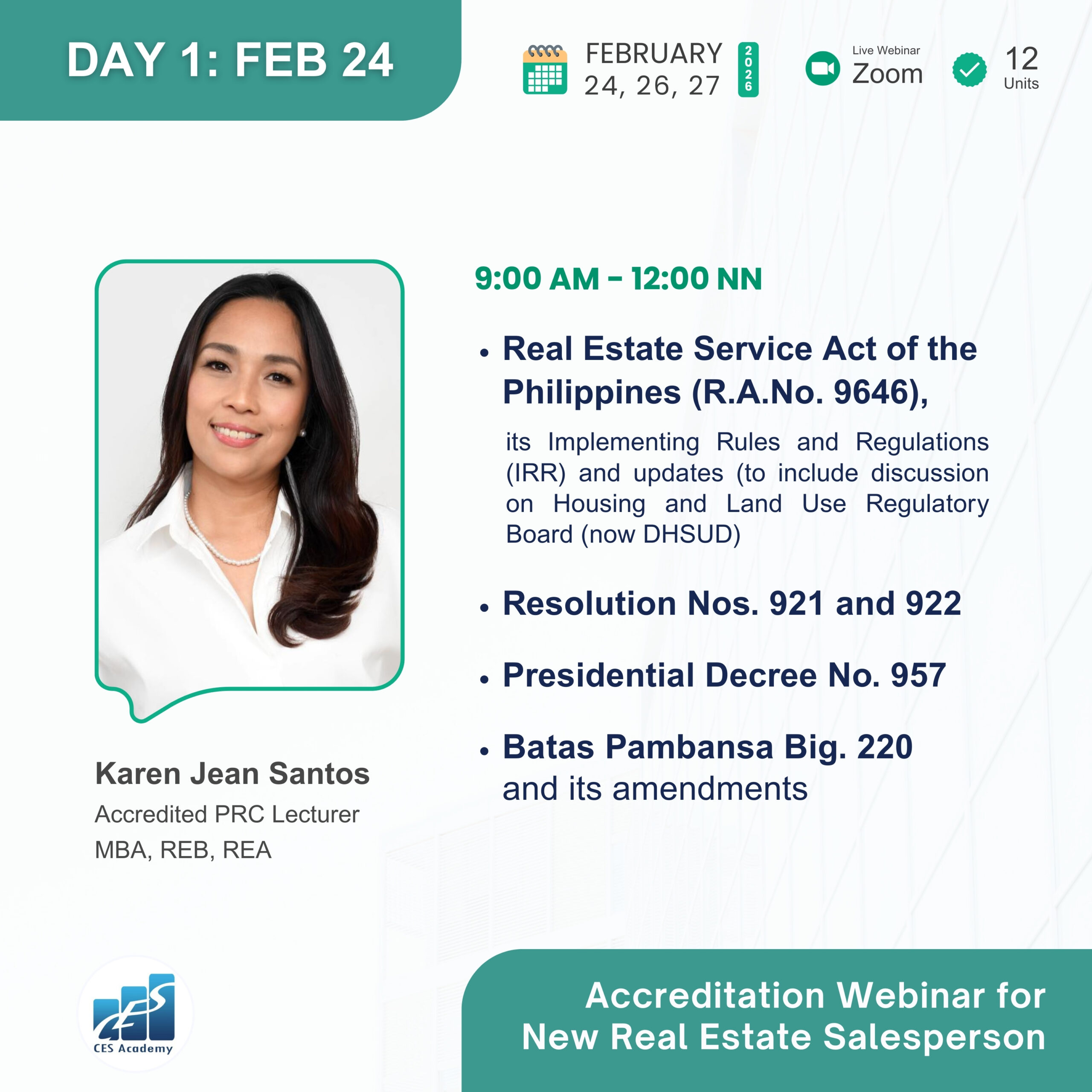 CES Academy is a SEC-registered and PRC-accredited provider of real estate education and training in the Philippines. It is the best choice of review center when opting to take the PRC Broker’s and Appraiser’s Licensure Examinations. Likewise, it offers seminars and workshops on special areas like Documentation and Registration, Due Diligence, Real Estate Marketing, Property Management, Basic Appraisal, and Estate Planning, to name a few.