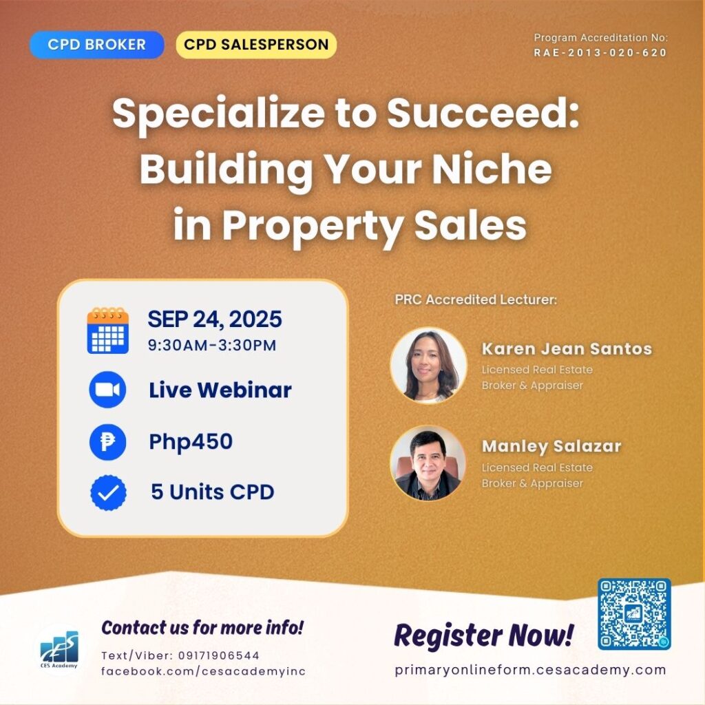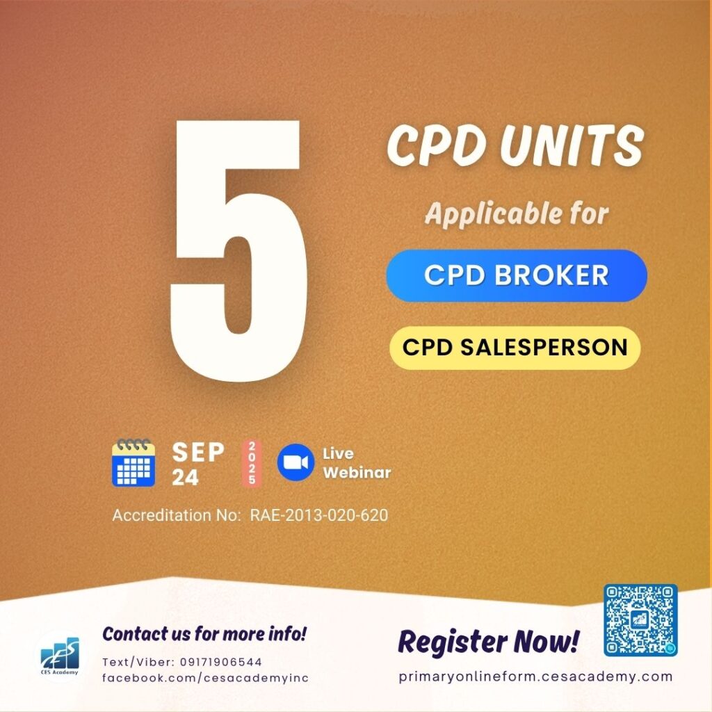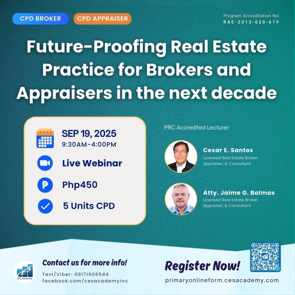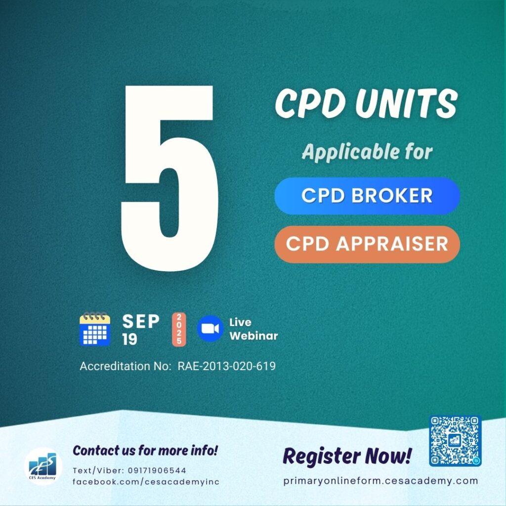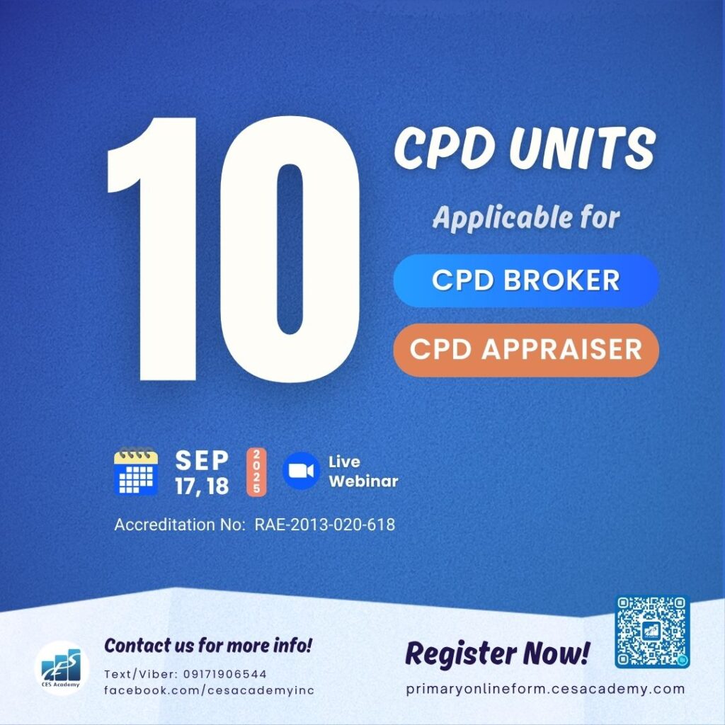 Register Now ⤷ Step 1: PAY BDO Acct. No: 006518004116Account Name: Cesar E. Santos Real Estate Academy, Incor CES Academy (for online transfer) Step 2: REGISTER Register viaCES ACADEMY Primry Online Form Step 3: ATTEND Webinar link will be sent upon verification of payment CPD BROKER / APPRAISER Investment Diversification: Correlation of Stocks and Real Estate March 13-14, 2020 8:00 AM - 5:30 PM Unit 2114, 21st Flr, Cityland 10, Tower 1, HV Dela Costa St, cor Ayala Ave., MAKATI CITY Php 2,500 CPD BROKER / APPRAISER Comprehensive Study of the Various Documents and Processes in Philippine Real Estate Transactions March 20-21, 2020 8:00 AM - 5:30 PM Shang Properties, Basement, Shangri-La Plaza, EDSA, Mandaluyong City Php 2,500 CPD BROKER / APPRAISER Know the Ropes of Financing: Thru Sale, Development and Mortgage March 27-28, 2020 8:00 AM - 5:30 PM Unit 2114, 21st Flr, Cityland 10, Tower 1, HV Dela Costa St, cor Ayala Ave., MAKATI CITY Php 2,500 CPD BROKER / APPRAISER Creating Effective Sales Organization February 14-15, 2020 8:00 AM - 5:30 PM Unit 2114, 21st Flr, Cityland 10, Tower 1, HV Dela Costa St, cor Ayala Ave., MAKATI CITY Php 2,500 CPD BROKER / APPRAISER Mastering Effective Due Diligence February 28-29, 2020 8:00 AM - 5:30 PM Shang Properties, Basement, Shangri-La Plaza, EDSA, Mandaluyong City Php 2,500 CPD BROKER / APPRAISER Succeeding Real Estate Appraisal thru Practice and Business with Appraisal Workshop January 10-11, 2020 8:00 AM - 5:30 PM Unit 2114, 21st Flr, Cityland 10, Tower 1, HV Dela Costa St, cor Ayala Ave., MAKATI CITY Php 2,500 CPD BROKER / APPRAISER Real Estate Transfers: Grantor's and Grantee's Obligations January 17-18, 2020 8:00 AM - 5:30 PM Shang Properties, Basement, Shangri-La Plaza, EDSA, Mandaluyong City Php 2,500 CPD BROKER / APPRAISER Estate Planning, Succession, Family Code and Investment January 24-25, 2020 8:00 AM - 5:30 PM Unit 2114, 21st Flr, Cityland 10, Tower 1, HV Dela Costa St, cor Ayala Ave., MAKATI CITY Php 2,500 Seminar Calendar Need an Accreditation Renewal for your Salesperson? Check-out our upcoming Salesperson Accreditation Seminar Schedule YES, I want them to be an accredited and legit salesperson!